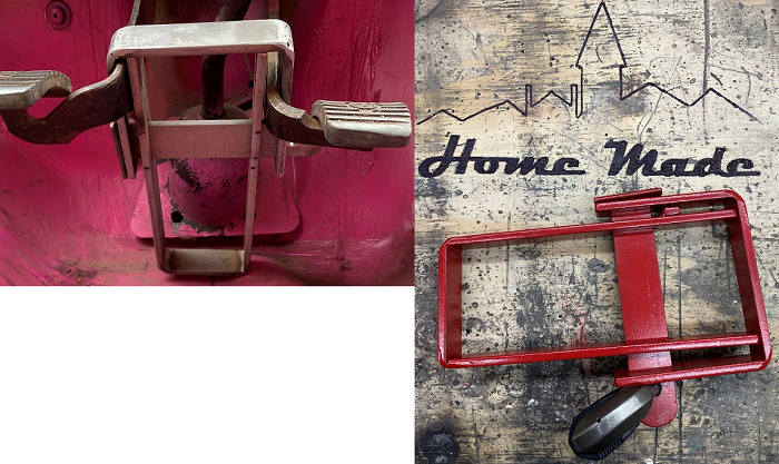 | Omdat ik de cabine wil spuiten om deze weer in ere te herstellen zal er geschuurd moeten worden en dan laat je de deuren open, tenminste, ik wel. Het was afgelopen weekend echt Hollands zomerweer dus werken dat schuren ging het niet worden. Maar om toch een beetje bezig te zijn heb ik een pedalenslot gemaakt van 6mm dik platstaal en ik mag wel zeggen dat ik tevreden ben met het resultaat. |
