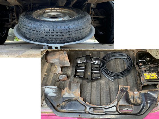 | Vandaag weer even heen en weer naar Heerhugowaard gereden om even bij te babbelen en natuurlijk wat onderdelen op te halen. Dit keer een reservewiel en wat motorbeplating inclusief het motorruim afsluit rubber, op drie stukken plaatwerk na is de motorbeplating compleet. Op internet heb ik er eentje gevonden maar nog niet besteld, eerst nog even verder zoeken of ik ze alle drie in eenieder kan bestellen. Nu nog uitvogelen of er een bepaalde volgorde van montage in zit, maar als ik kijk wat er nog wel in zit denk ik haast niet maar de praktijk zal het ons leren. |